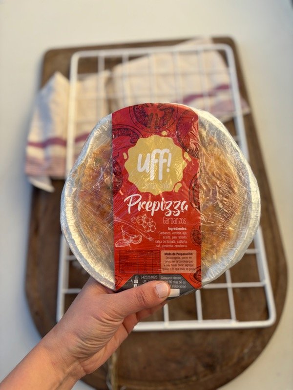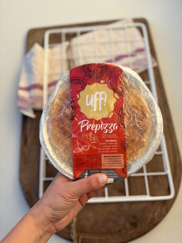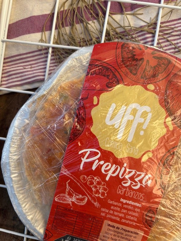 Prepizza de lentejas: contiene lentejas, zanahoria, aceite, pan rallado, cebolla, salsa de tomate, sal, pimenta, ajo.